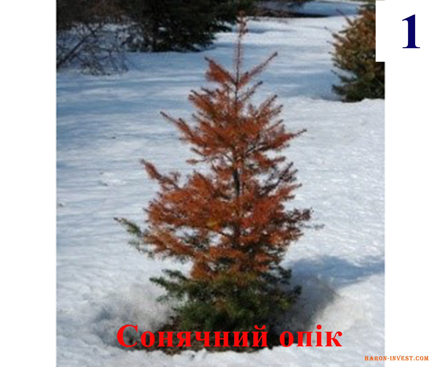 Починаючи з кінця лютого кількість сонячної радіації починає неухильно зростати. Це стимулює обмінні процеси в клітинах зеленої хвої. Фотосинтез, який до цього часу відбувався мляво, з кожним днем набирає обертів. Ці процеси вимагають підвищеної кількості води, запаси якої в надземних тканинах обмежені. Коренева система не здатна врятувати рослину в такий період – проморожений ґрунт міцно тримає водні залягання. У результаті клітини хвої без-зволожуються. Хвоя пересихає, набуває коричневе-бурого забарвлення і через деякий період часу починає опадати. В такій ситуації можуть засихати навіть цілі гілочки.