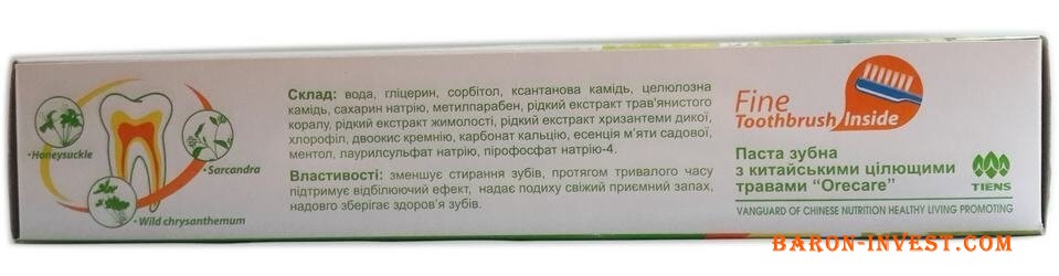Зубная паста Тяньши с мятным вкусом содержит экстракты саркандры гладкой, жимолости японской, цветков дикой хризантемы.