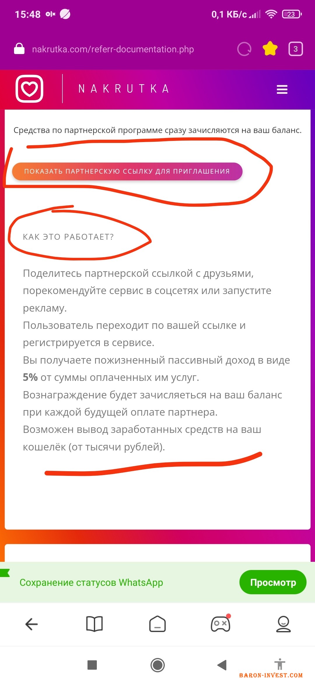 За для вашої впевненості , можу надати вам посилання на сайт з яким ви в подальшому будете працювати , и ви переконаєтесь у тому що без придбаного посилання ціною всього 45 грн, ви просто не зможете зайти і почати заробляти а також можу надати знімки екрана , де детально показано куди потрібно переходити и де знайти своє посилання яке ви і будете продавати , також і перевіряти свій поточний рахунок відсотків покупців які будуть переходити за проданим вами посиланнями.