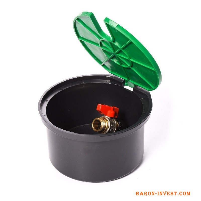 Особенность и главное отличие подземного бокса с краном GreenBox - наличие встроенного крана внутри бокса для подключения садового шланга. Кран выполнен с наружной резьбой 3/4", а подключение бокса осуществляется снизу, где расположена резьба 3/4" ВР.