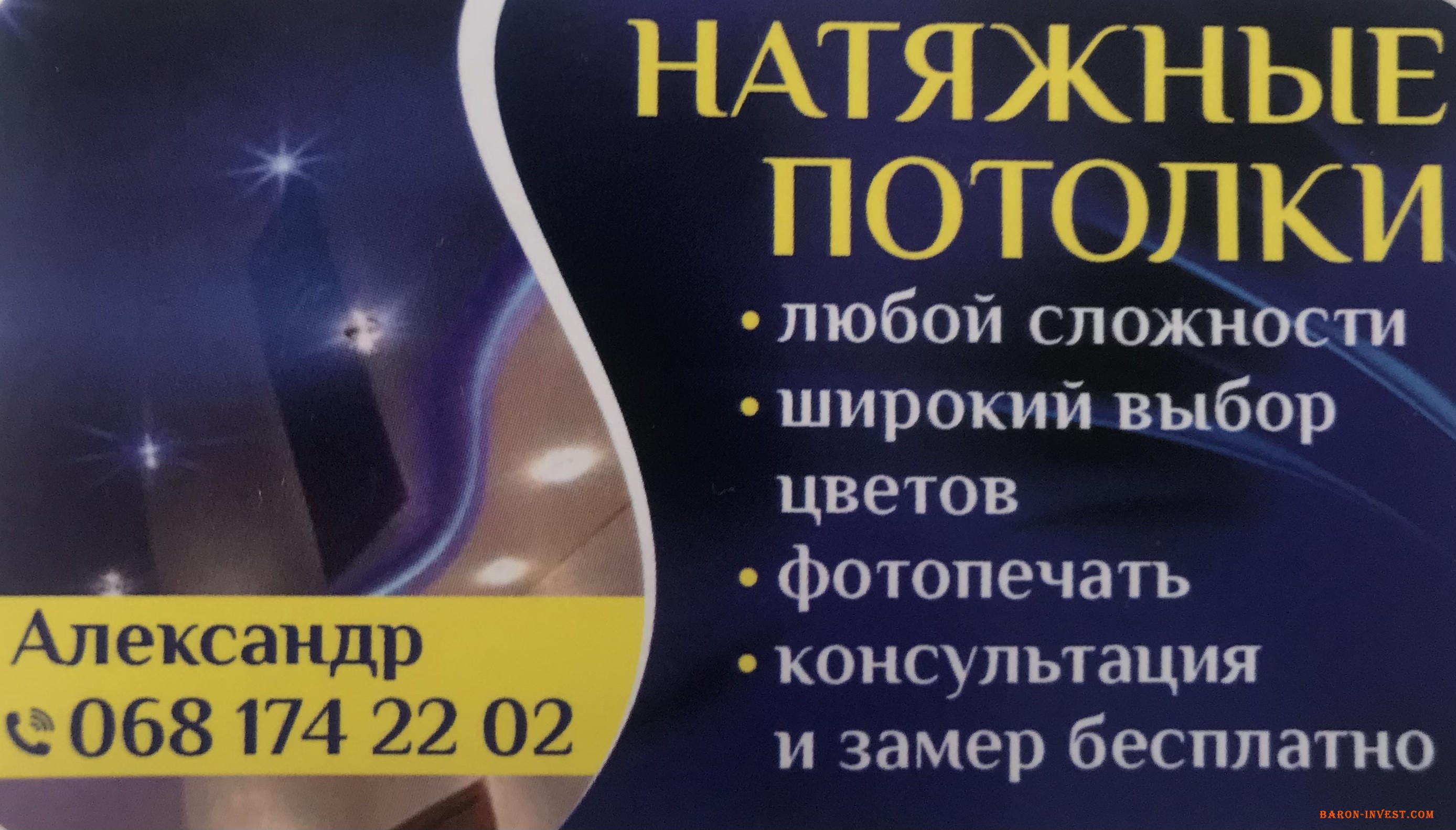Натяжные потолки любой сложности и конструкции, широкий выбор цветов, фотопечать. Замер и консультация бесплатно.Так же производим обслуживание потолков.Подробная информация по телефону,можно писать в Телеграмм, Вайбер. 068 174 22 02 Александр.