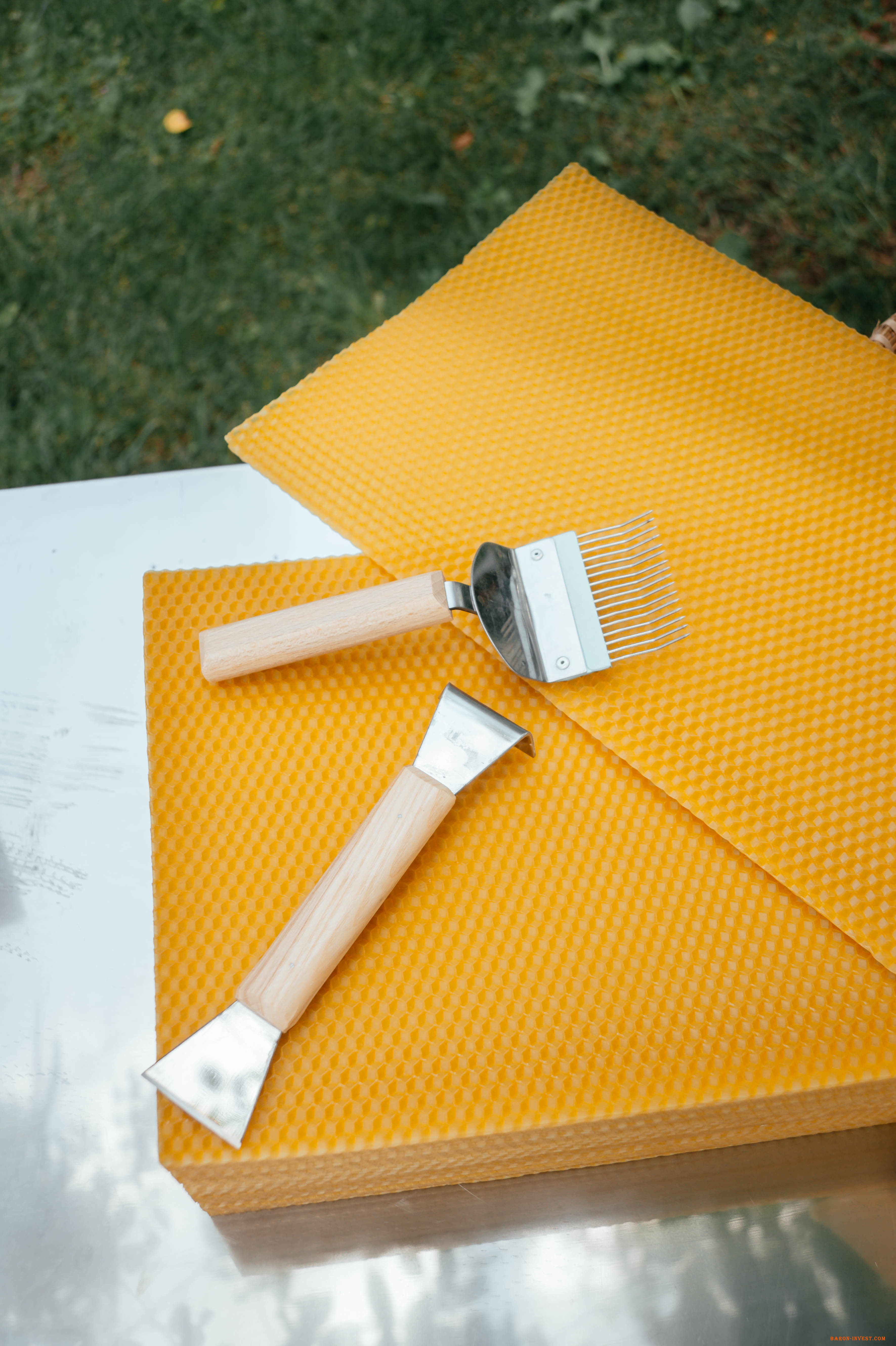Материалы и элементы, используемые при изготовлении товара: вощина представляет собой тонкие листы, изготовленные исключительно из натурального воска, без добавления посторонних примесей, прошедшего термическую и антибактериальную обработку с ячейками шестиугольной формы светло-желтого или желтого цвета. Вощина соответствует ДСТУ 7172:201