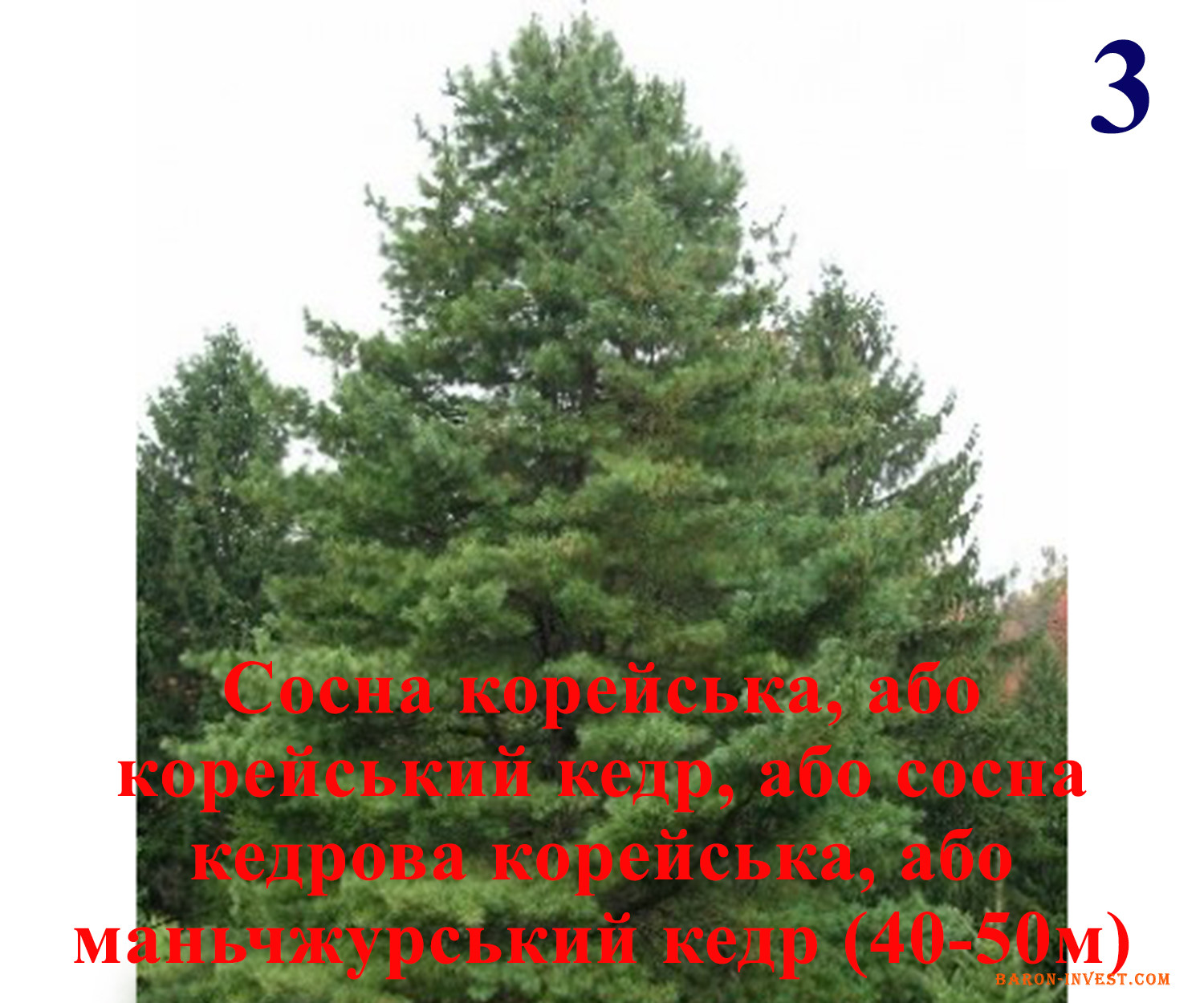 3) Сосна корейська, або корейський кедр, або сосна кедрова корейська, або маньчжурський кедр (40-50м)